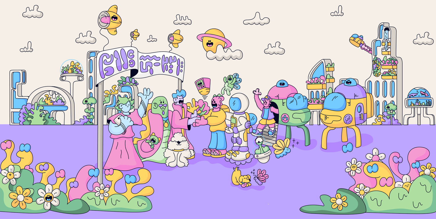 His illustrative world is characterized by bubble-shaped, stretchy elements, maintaining a cohesive aesthetic.