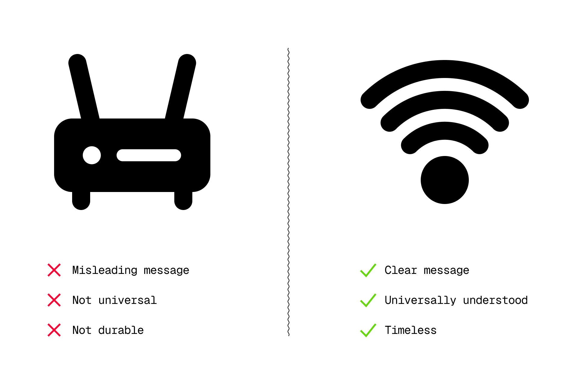 For example, the Wi-Fi symbol is easily recognizable and universally widespread, whereas a router could cause confusion, as well as being tied to a specific and outdated model. It's not about being conventional, it's about being functional.
