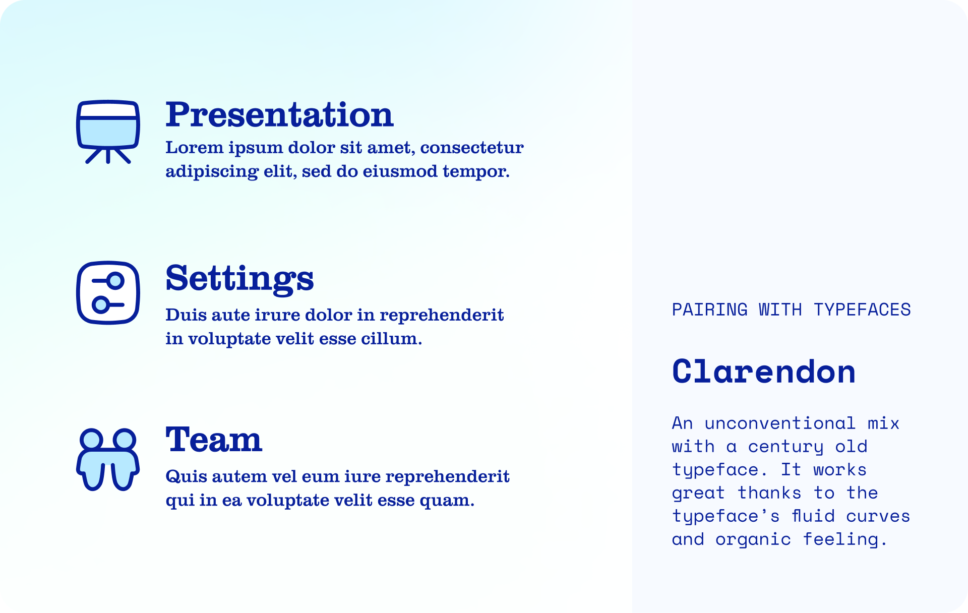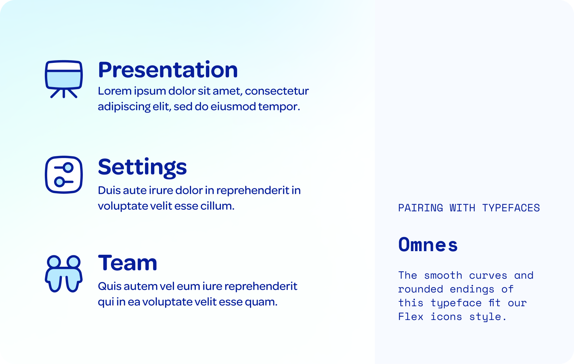 Flex icons work great with typefaces that share the same spirit of fluidity and dynamism. Use fonts with smooth curves, rounded ends and large negative space to create a cohesive and impactful design system.