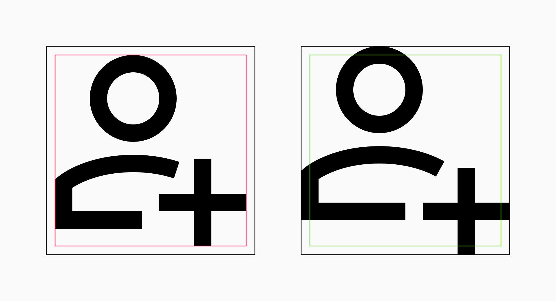 In the case of the key shapes, we must break these guidelines when the icons have too much negative space or the silhouettes are very irregular. Basically it's about ensuring that all icons take up a similar amount of space.