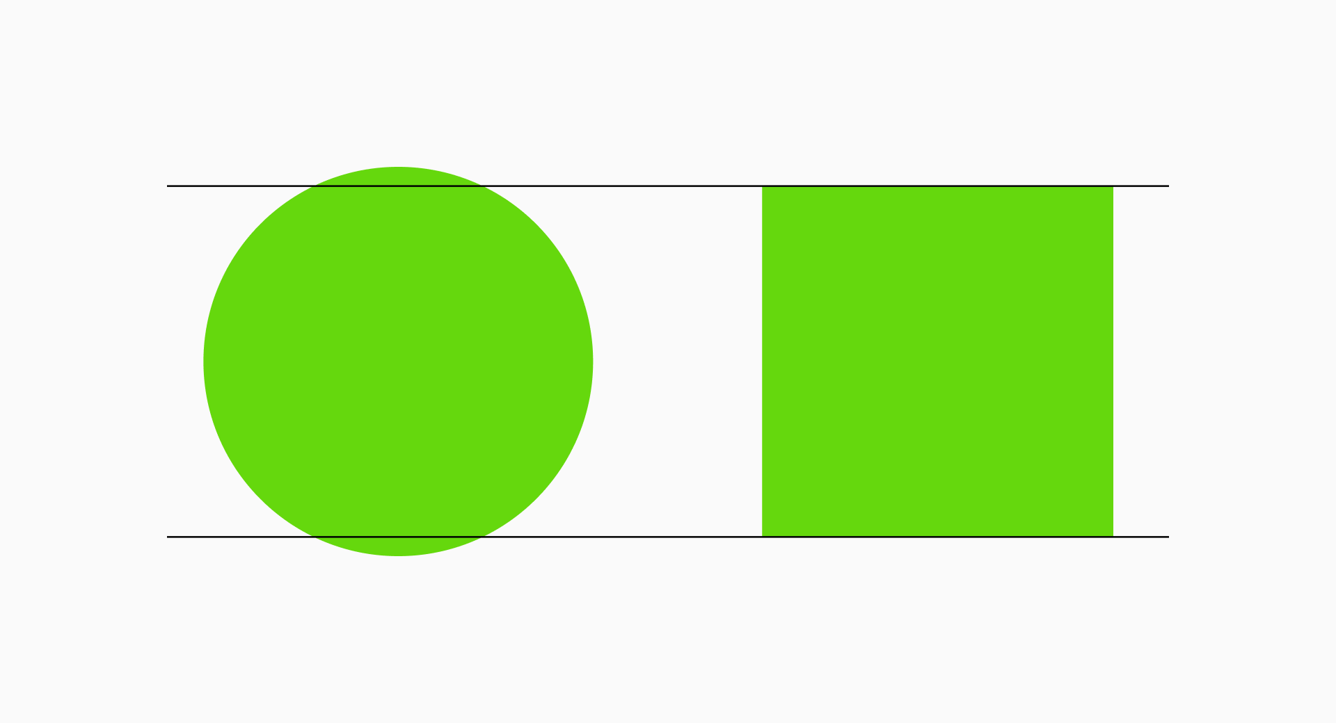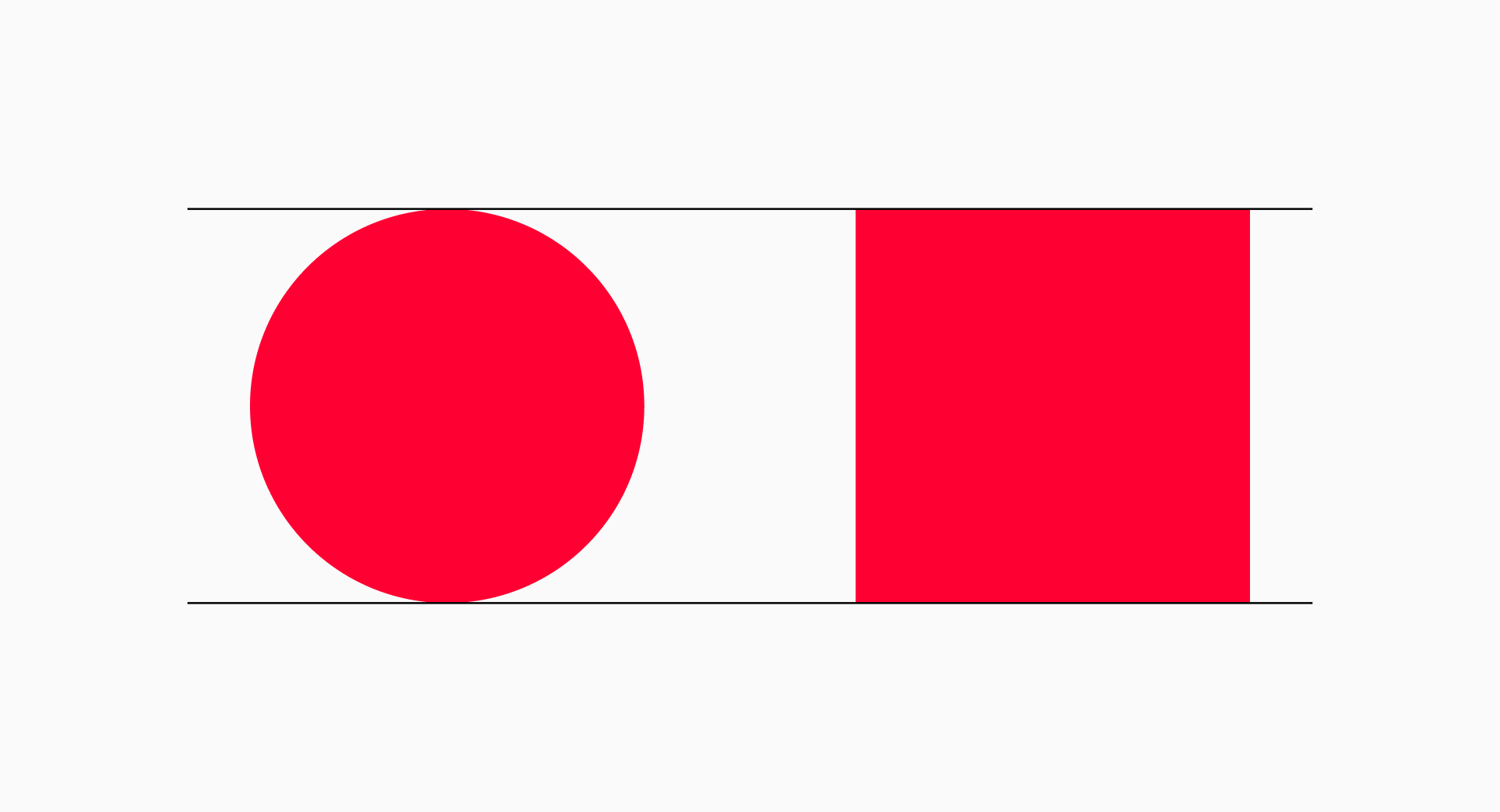Rectangles. On the other hand, rectangles would present more "extreme" proportions. So to keep them balanced we'll normally take the width of the circle to set the width of the horizontal rectangle while making it slightly shorter than the square. Following a similar process, we'll take the height of the circle to define the height of the vertical rectangle and make sure it's a bit narrower than the square.