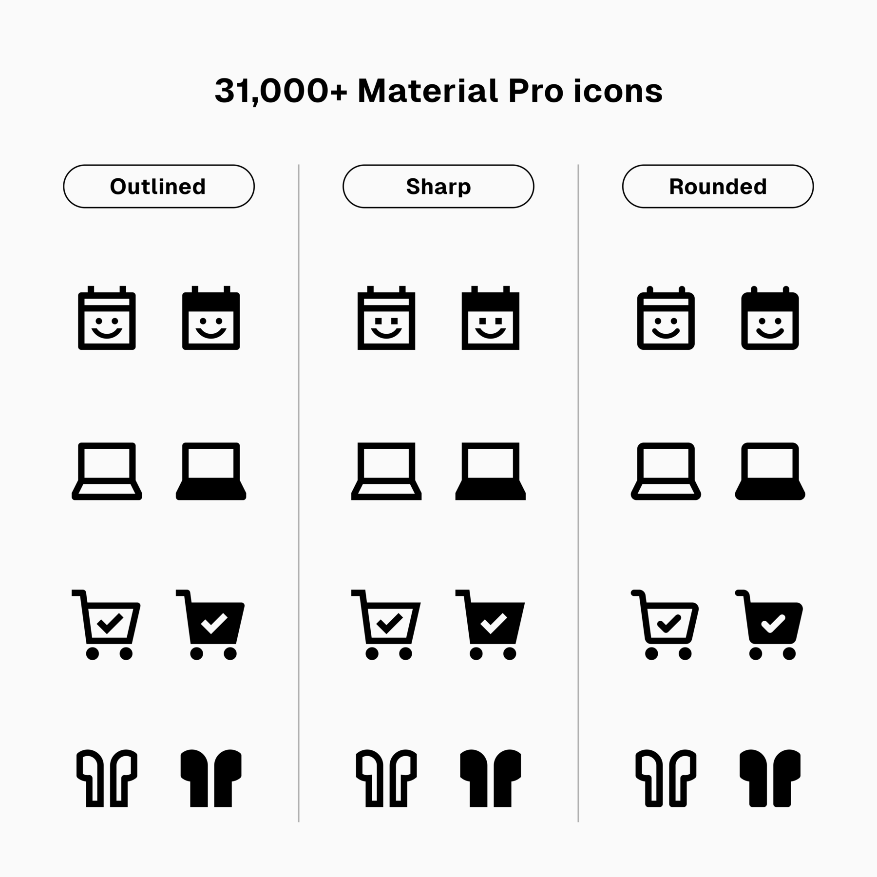 Material Pro took Google’s Material Symbols and expanded it. We've redrawn Outlined, Sharp and Rounded styles. Material Pro has 50% more icons. We've also added a free sampler pack for Material Pro, with 6,000+ SVGs.