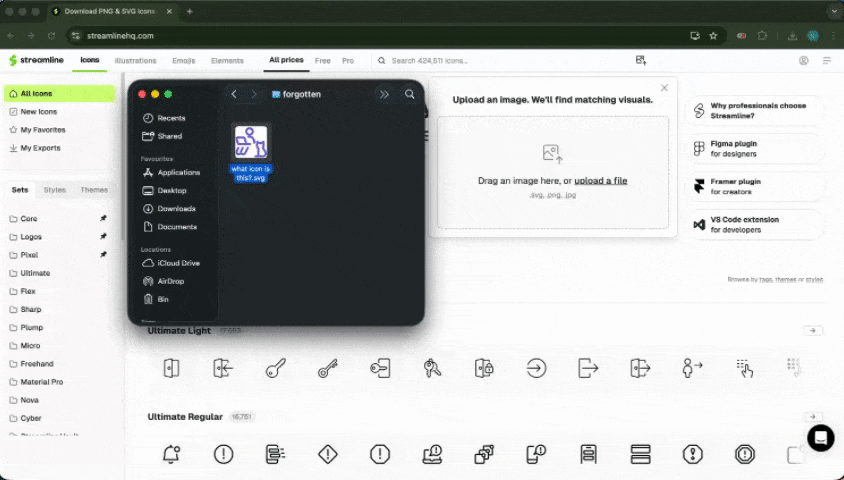 Just drop in an image, and Streamline finds the closest matching icons or illustrations. Perfect for tracking down that icon you've used before or finding visuals that match a photo.
