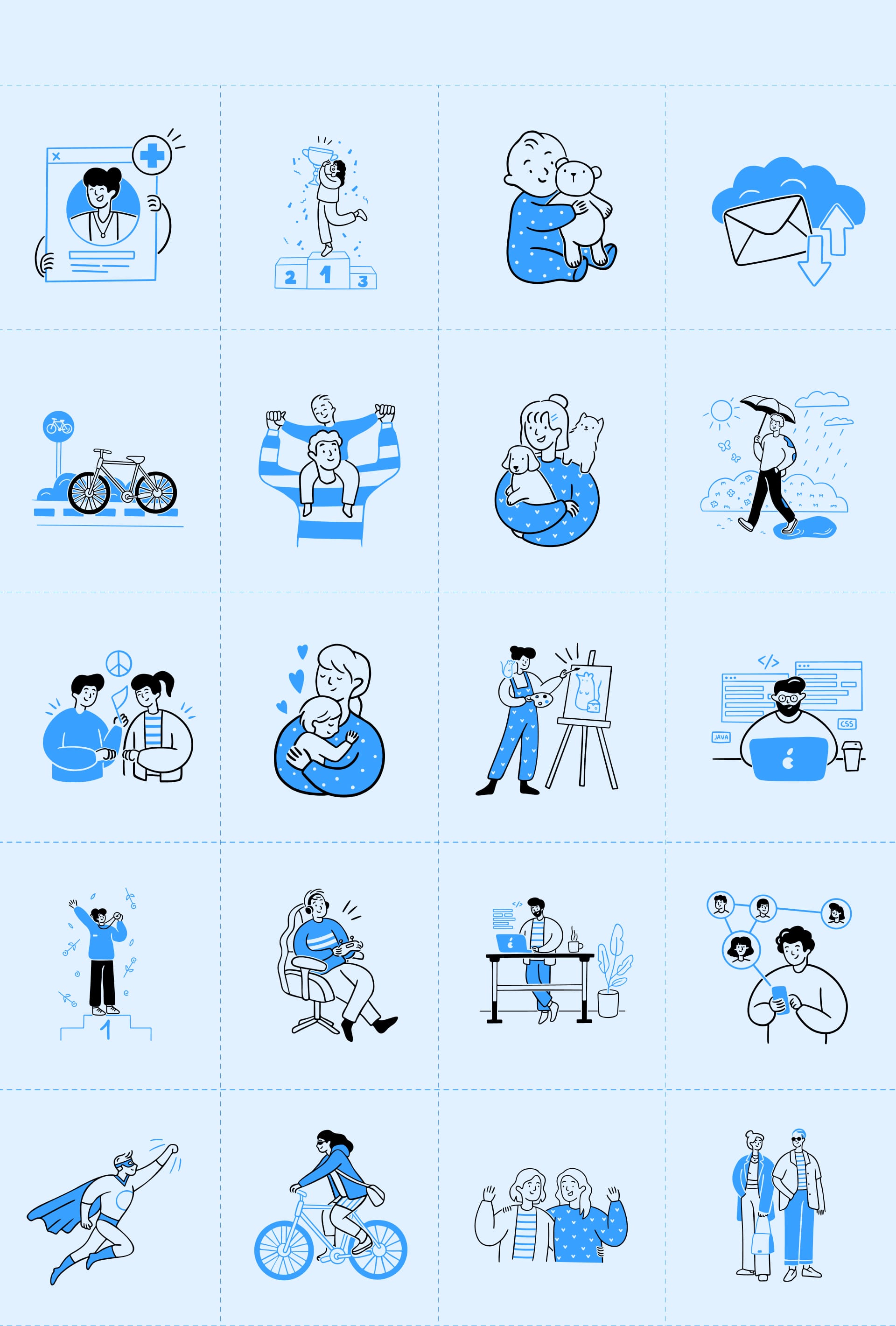 Brooklyn's art style is pretty straightforward and monochromatic in terms of color. With Blue and White as the main colors, From trendy and energetic urban style, that is easy to adapt to your branding, these illustrations breathe life into any project!